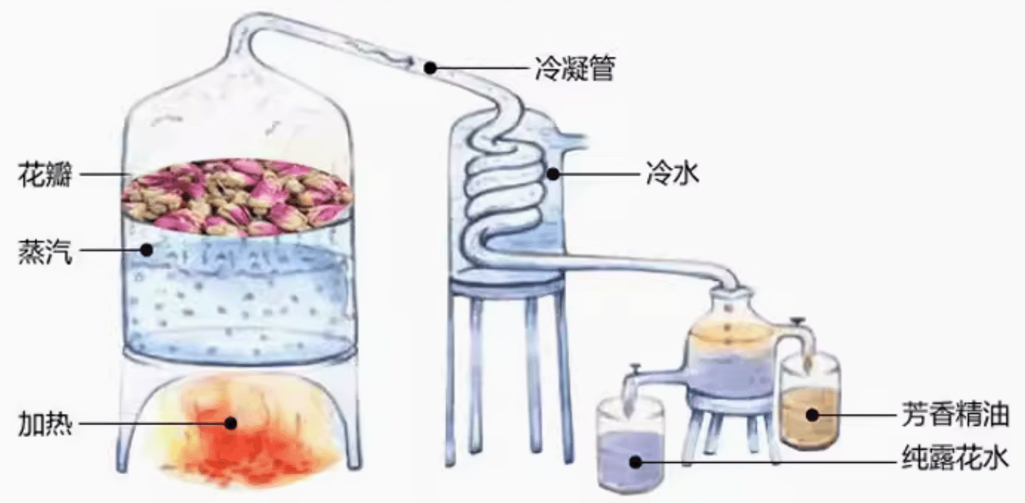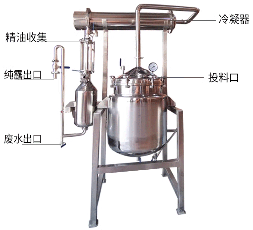 的不銹鋼蒸餾容器(蒸餾器),在容器底部加熱或通入蒸汽。當(dāng)炙熱的蒸氣充滿在容器里,會將植物內(nèi)存的芳香精油成分隨著水蒸氣蒸發(fā),并且隨著水蒸氣通過上方
